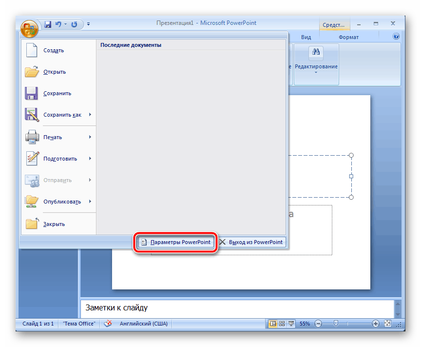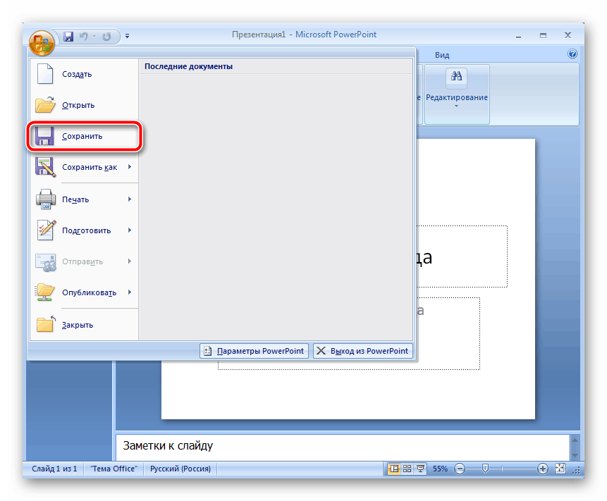 Перед сохранением нажмите на значок меню и выберите там пункт «Параметры PowerPoint».