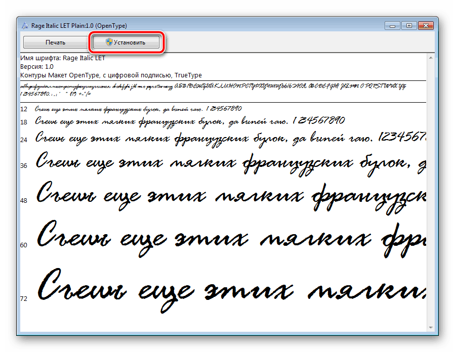 Вам будет показано как выглядит текст, написанный данным шрифтом. В верхней части окна нажмите на кнопку «Установить»