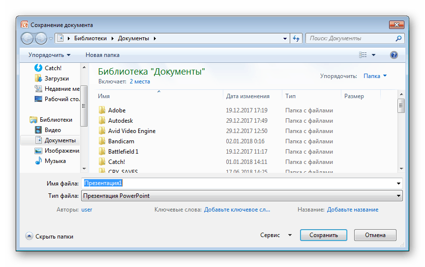 Укажите место, куда хотите сохранить презентацию, дайте ей название и нажмите на соответствующую кнопку, чтобы завершить процесс.