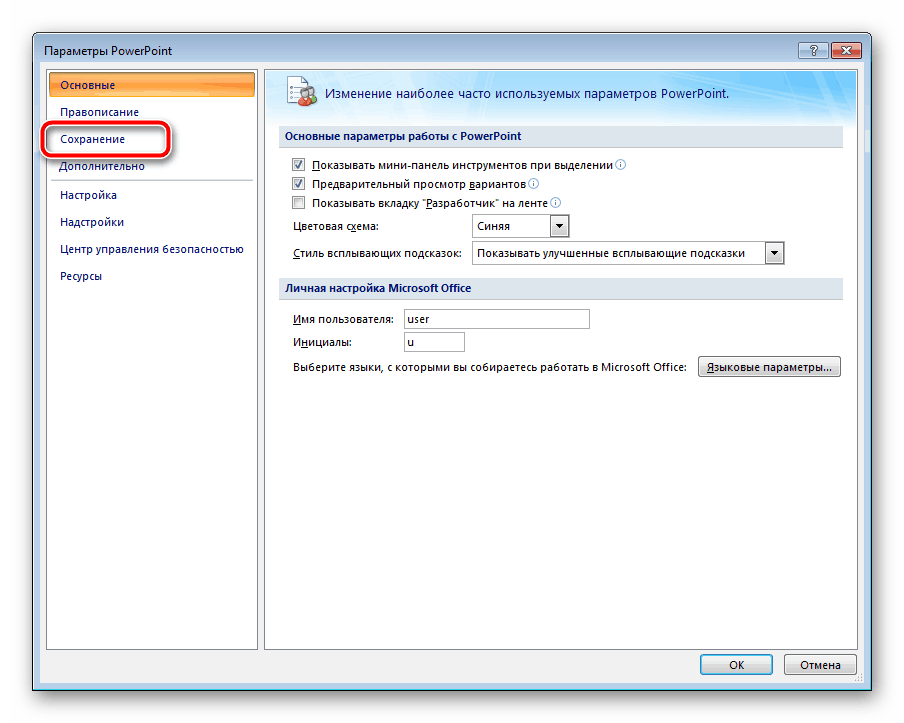- В окне «Параметры Word» переключитесь к разделу «Сохранение».