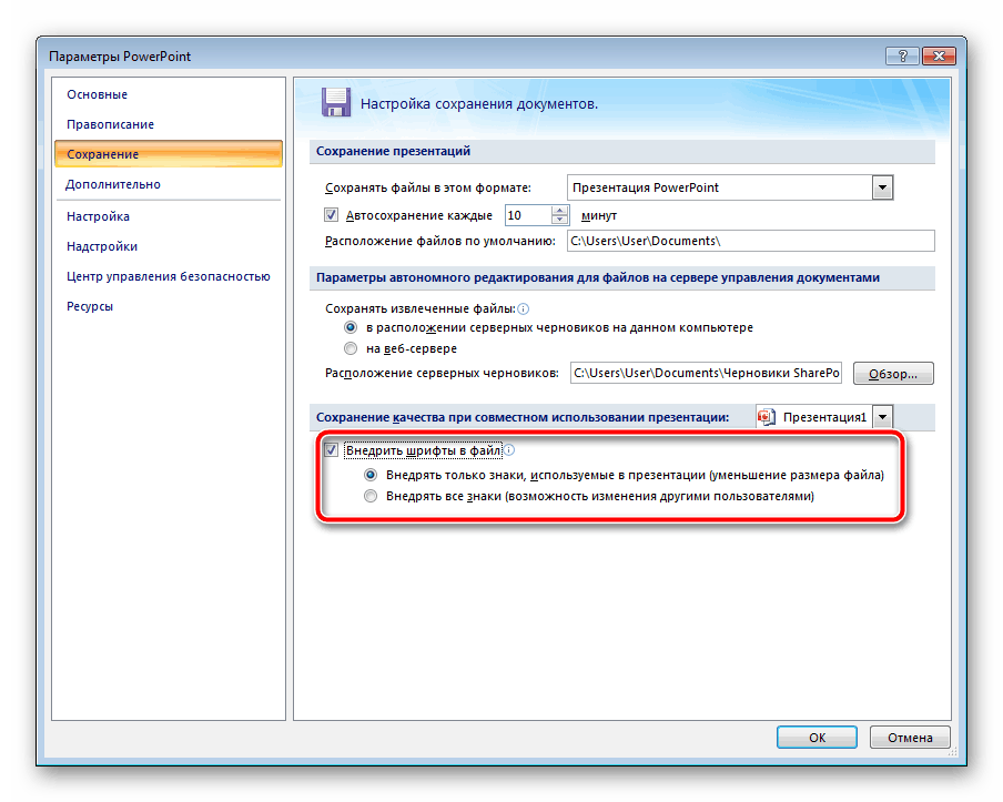 Внизу отметьте галочкой пункт «Внедрить шрифты в файл» и установите точку возле необходимого параметра.