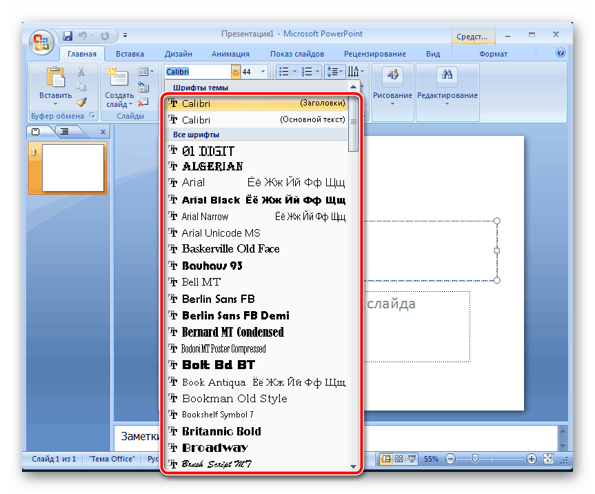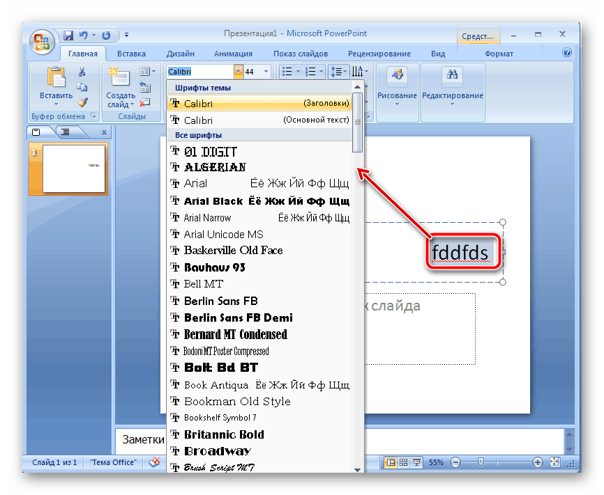 Теперь, для проверки, откроем . Выделяем текст и открываем список шрифтов.