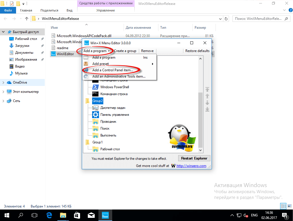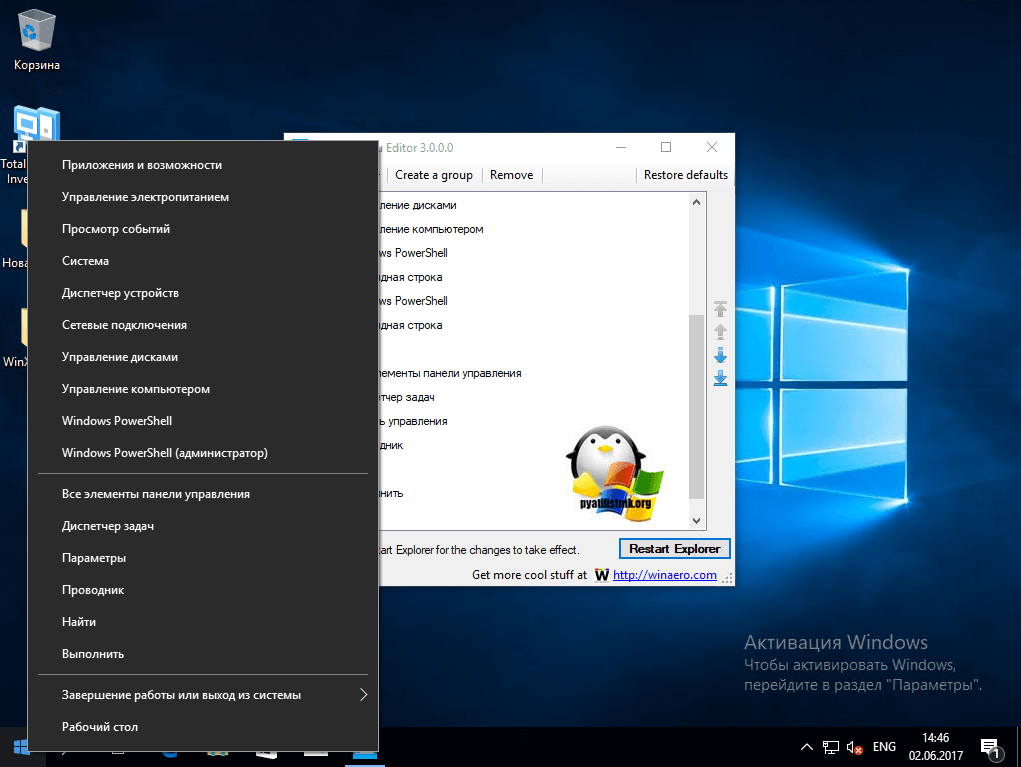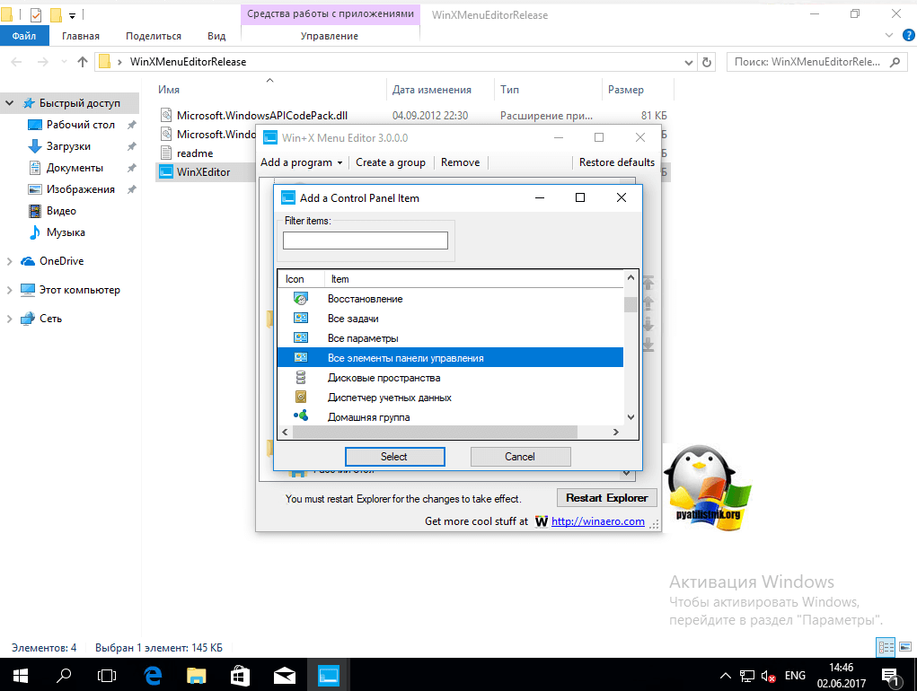 Все проверяем, у вас утилита Win+X Menu Editor должна добавить панель управления в Windows 10, у меня появился пункт «Все элементы панели управления», мне так не нравится и я хочу его переименовать.