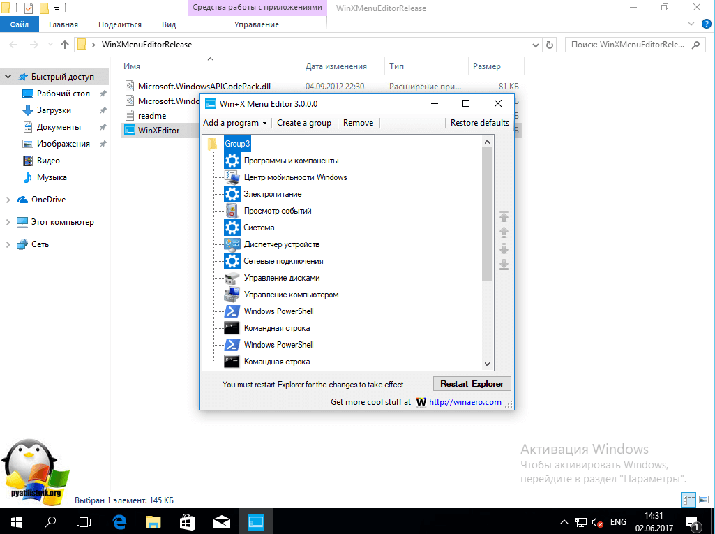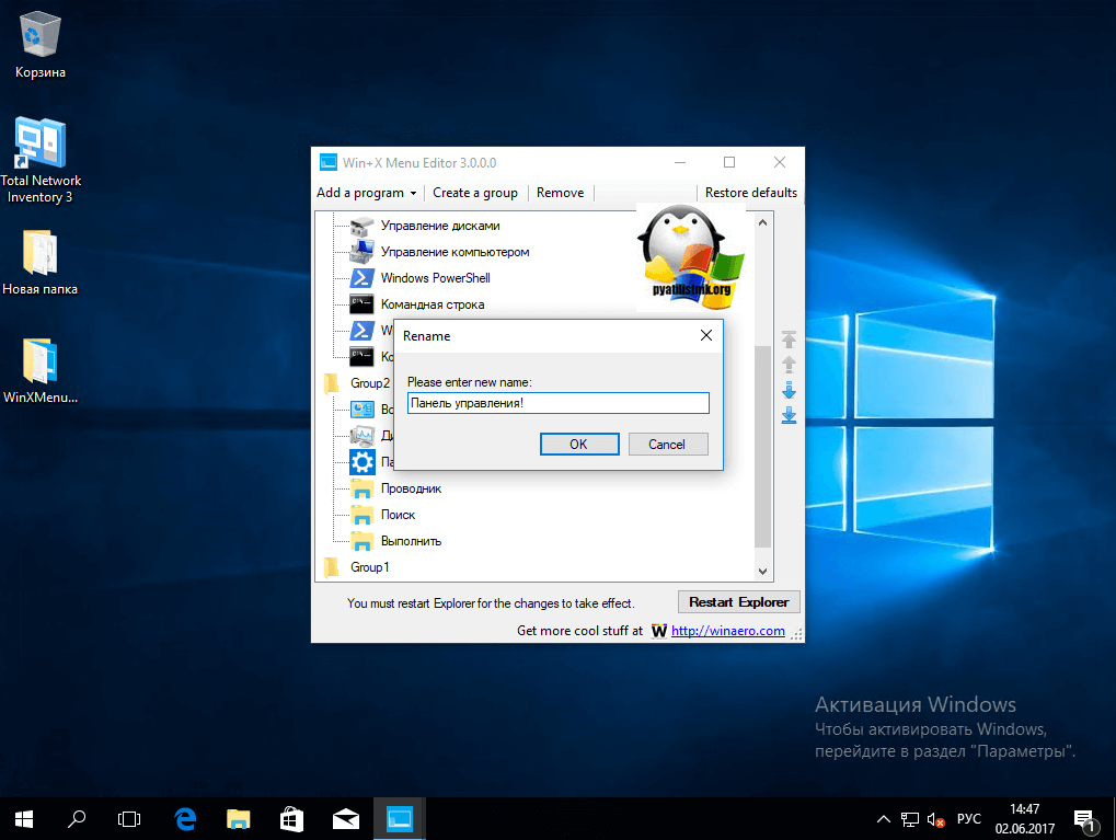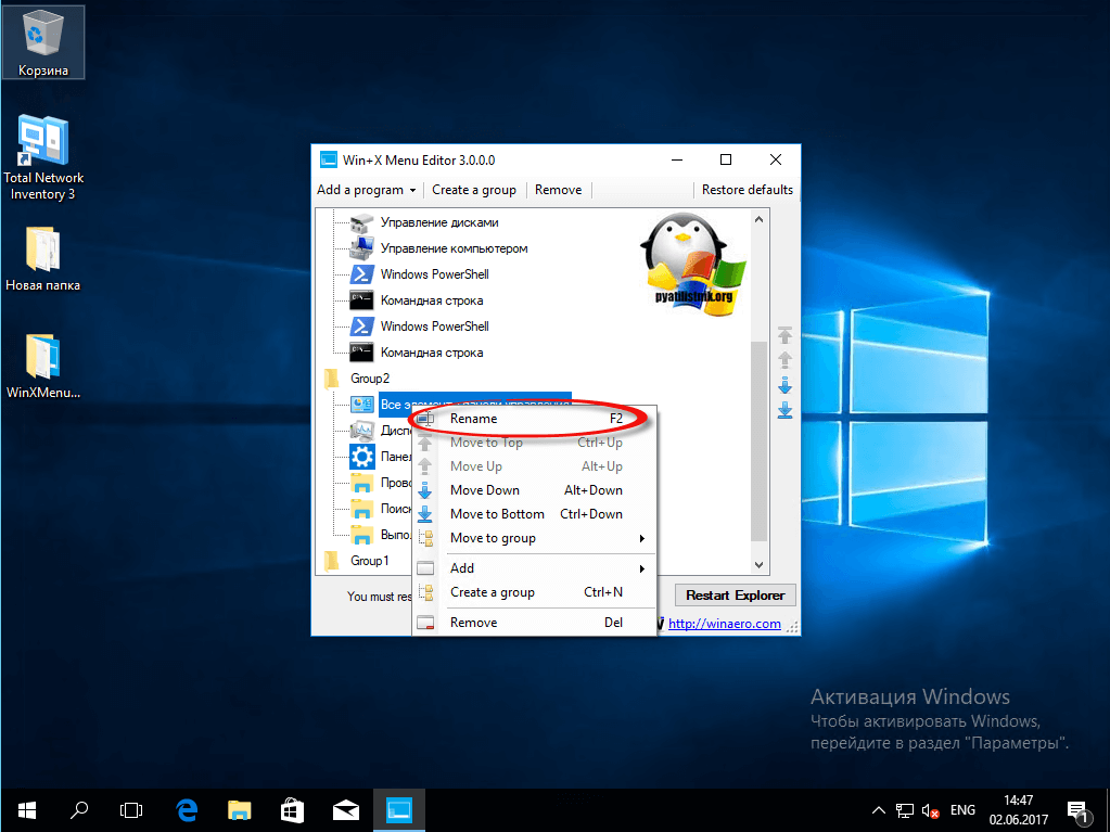 Переходим в утилиту Win+X Menu Editor и на нужном элементе нажимаем клавишу F2, для переименовывания пункта меню.