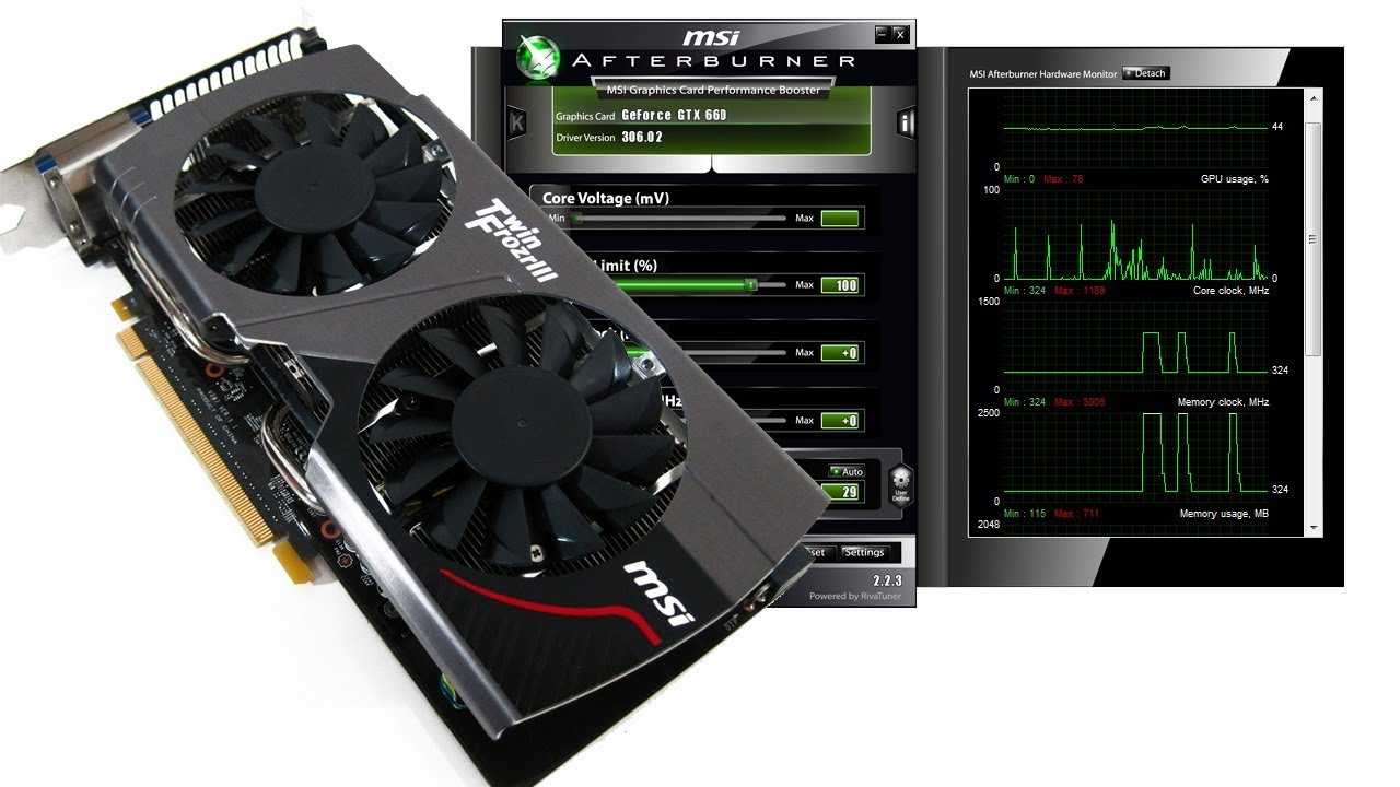 Основной утилитой, которая отвечает за увеличение производительности графики посредством разгона видеокарты, считается MSI Afterburner. Программа позволяет изменять частоту ядра, памяти, а также манипулировать рабочим напряжением (не для всех моделей карт). Впрочем, последний параметр использовать для разгона не рекомендуется, поскольку обычно графическая подсистема рассчитана на работу именно с номинальным, штатным напряжением. При его увеличении последствия могут оказаться непредсказуемыми.