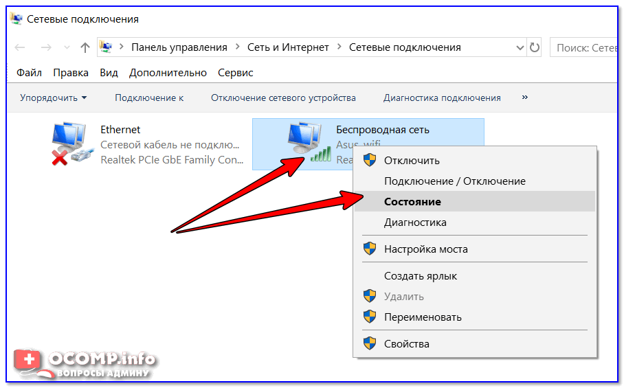 Для этого просто кликните по адаптеру правой кнопкой мышки и в контекстном меню выберите вкладку «Состояние»