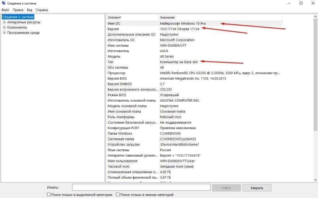 Все данные о типе системы, разрядности, версии и сборке ОС