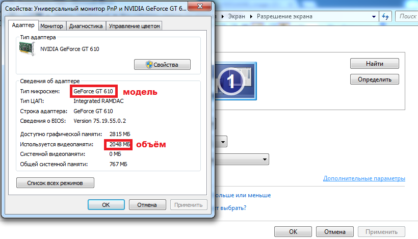 - Марка графической карты указывается в строке «Тип адаптера».