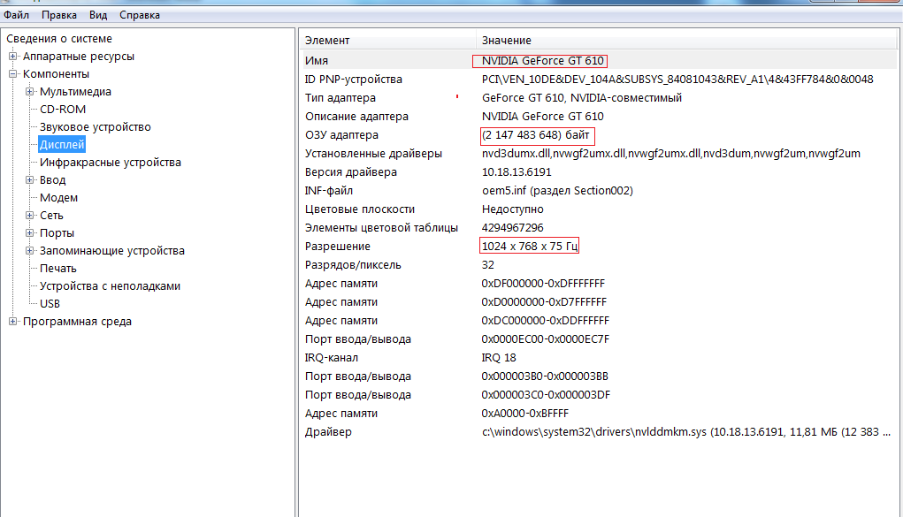 Сведения о системе — компоненты — дисплей — видеокарта