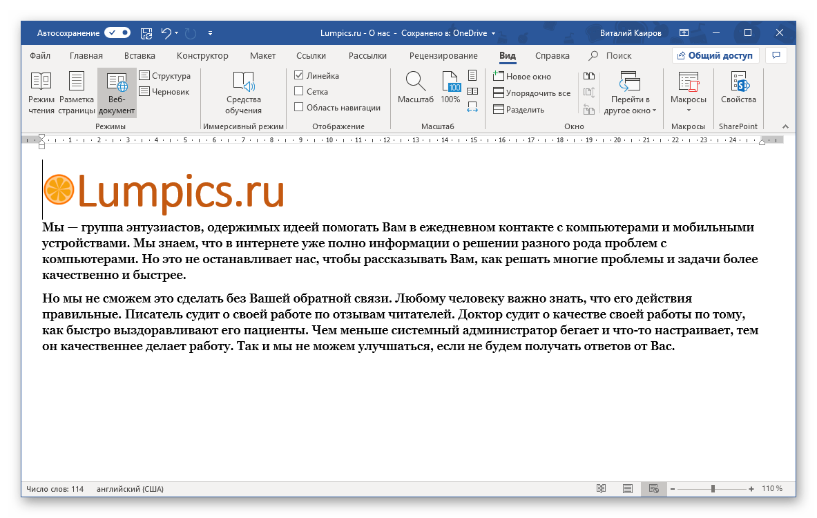 Линейка не отображается или отображается только горизонтальноПо умолчанию, и чаще всего этот параметр не меняется пользователем, работа с документом Word осуществляется в «Режиме разметки». Это стандартное для программы представление, и если включить в нем «Линейку», она появится как в горизонтальной, так и в вертикальной плоскости. Во всех остальных режимах отображения будет показана либо только горизонтальная линейка, либо она будет отсутствовать вовсе. Наглядный пример: