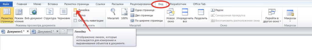 Если линейка скрыта, открываем вкладку Вид, на панели Показать устанавливаем галочку на Линейке: