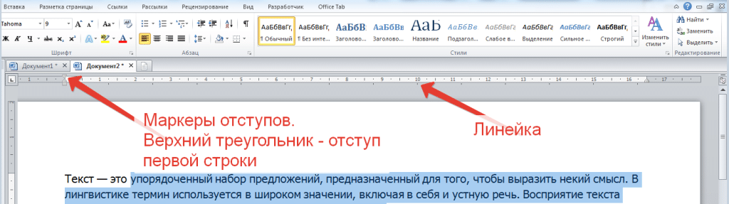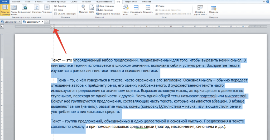 - В нашем примере выравнивание произошло, но отступ слева у второго абзаца больше, чем в остальных случаях. Чтобы установить отступы на одном уровне, перейдем на линейку (она расположена над рабочей областью листа).