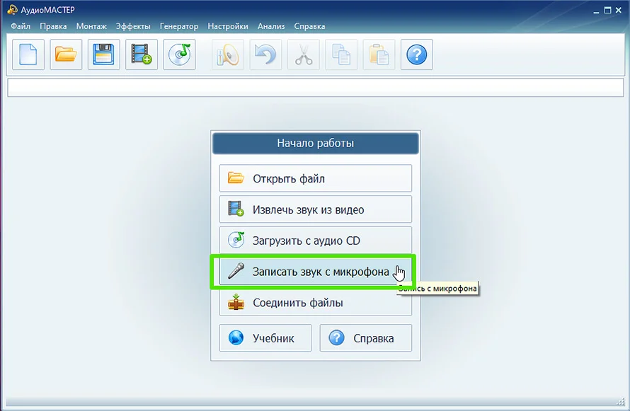 Запустите софт, в стартовом меню выберите запись с микрофона.