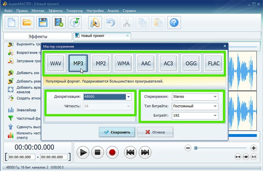 Когда трек будет готов, кликнете «Файл» – «Сохранить как». В окне мастера выберите желаемый формат (MP3, MP2, FLAC, AAC, WAV, WMA, OGG, AC3), уровень дискретизации (по умолчанию 48000), режим стерео или моно, постоянный или переменный битрейт. Для некоторых форматов настроек меньше. Сохраните результат с указанием имени файла и папки. Можете сразу отправить запись на флешку, телефон или плеер, подсоединив устройство по USB.