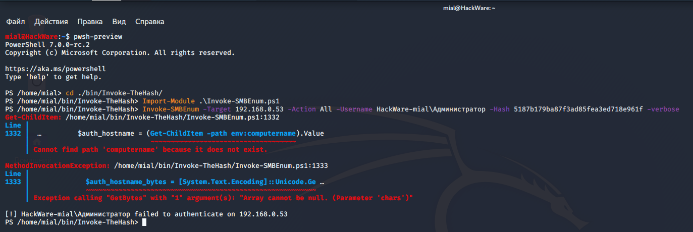 Invoke-SMBEnum -Target 192.168.0.53 -Action All -Username HackWare-mial\Администратор -Hash 5187b179ba87f3ad85fea3ed718e961f -verbose