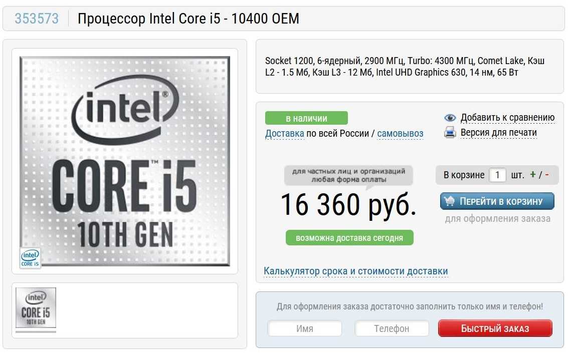 Начнем с главного в нашей сборке, с процессора Core i5-10400. В Регарде он стоит 16360 рублей. Вполне неплохо, учитывая цену его ближайшего по производительности предшественника — Core i7-8700.
