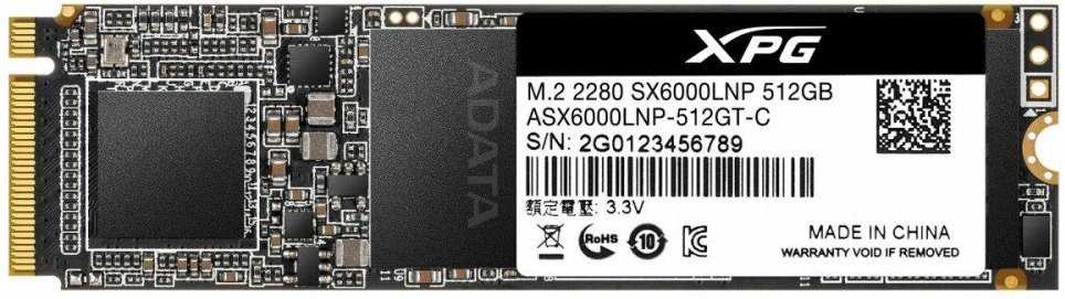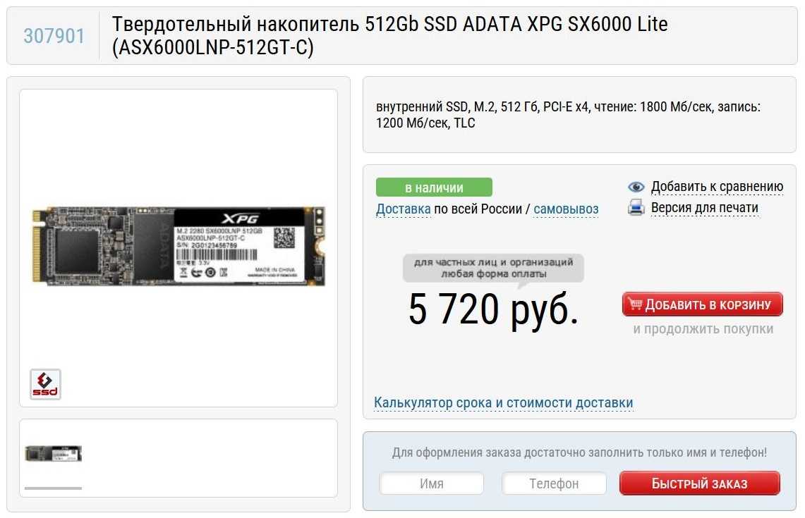 Это будет ADATA XPG SX6000 Lite (ASX6000LNP-512GT-C), емкость 512 Гб. Это недорогой, но очень быстрый SSD, со скоростями 1800 Мб/сек/1200 Мб/сек.