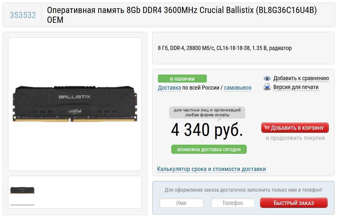 Оперативная память в нашей сборке будет подобрана по трем практически взаимоисключающим параметрам: недорогая, быстрая и неплохо разгоняющаяся. Всем этим параметрам отвечает Crucial Ballistix (BL8G36C16U4B). Эти модули имеют частоту 3600 МГц и объем 8 Гб. Цена ненамного выше исчезающих из продажи, популярных модулей серии AES, но и частота намного выше. Мы возьмем два модуля по 8 Гб.