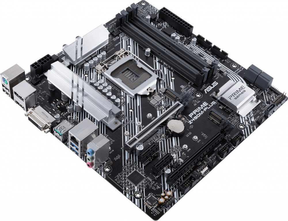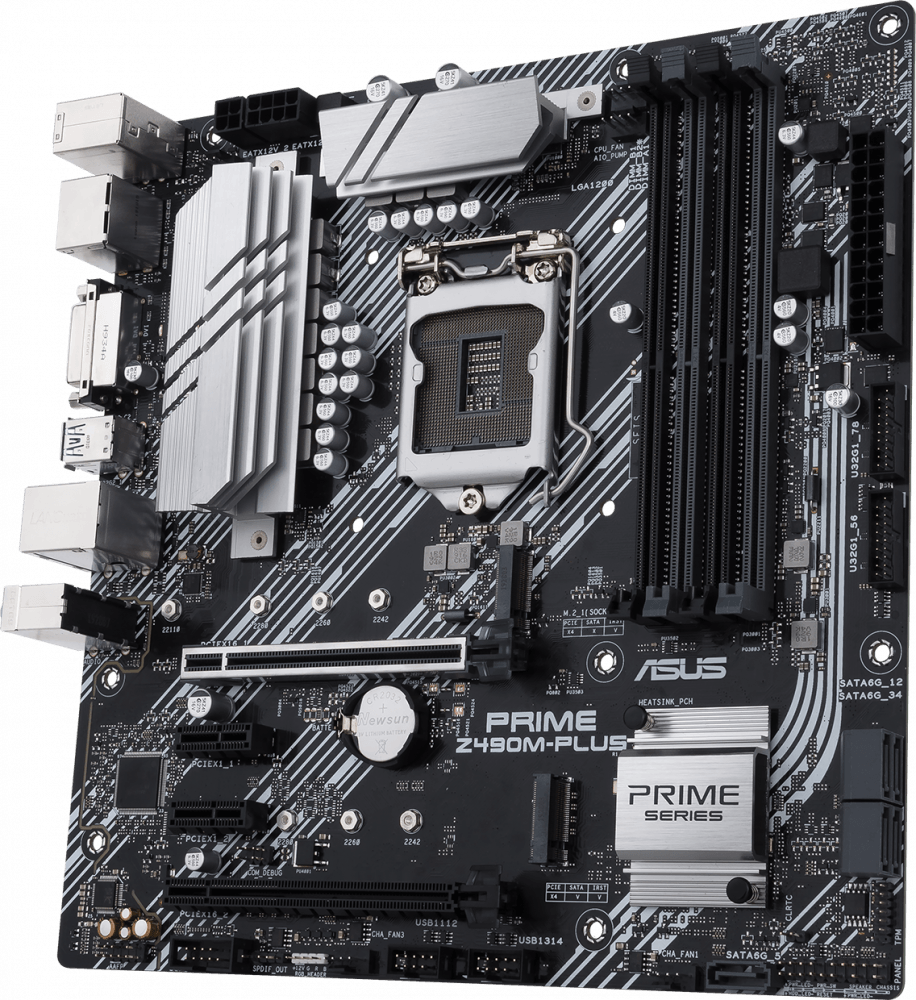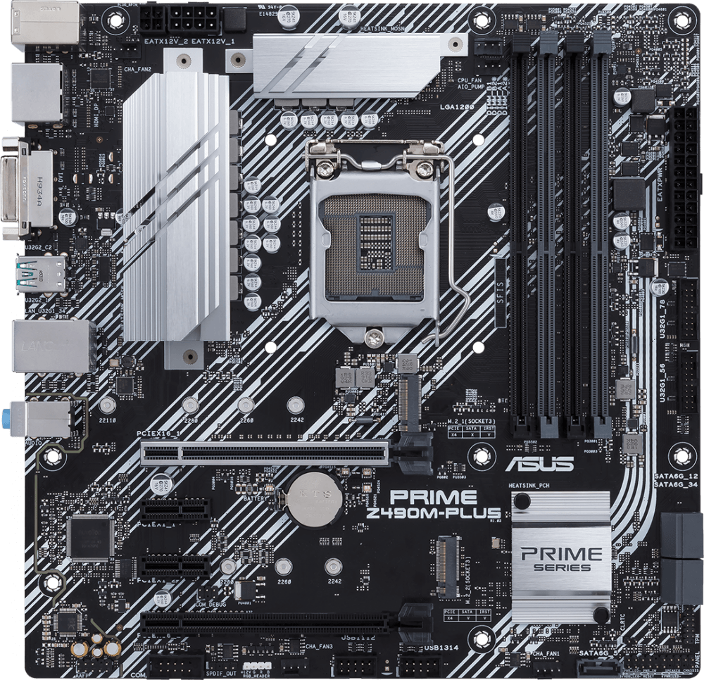 Плату в нашу сборку мы возьмем ASUS PRIME Z490M-PLUS. Она имеет массивные радиаторы на системе питания, питание процессора 4+8 пин, два слота PCI-E 3.0×16 и два разъема M.2.На задней панели, помимо стандартных — звука, сети и USB 2.0, есть два USB 3.2 Gen1, USB 3.2 Gen2, USB 3.2 Gen2 Type-C. И набор видеовыходов: DVI, HDMI, DisplayPort.