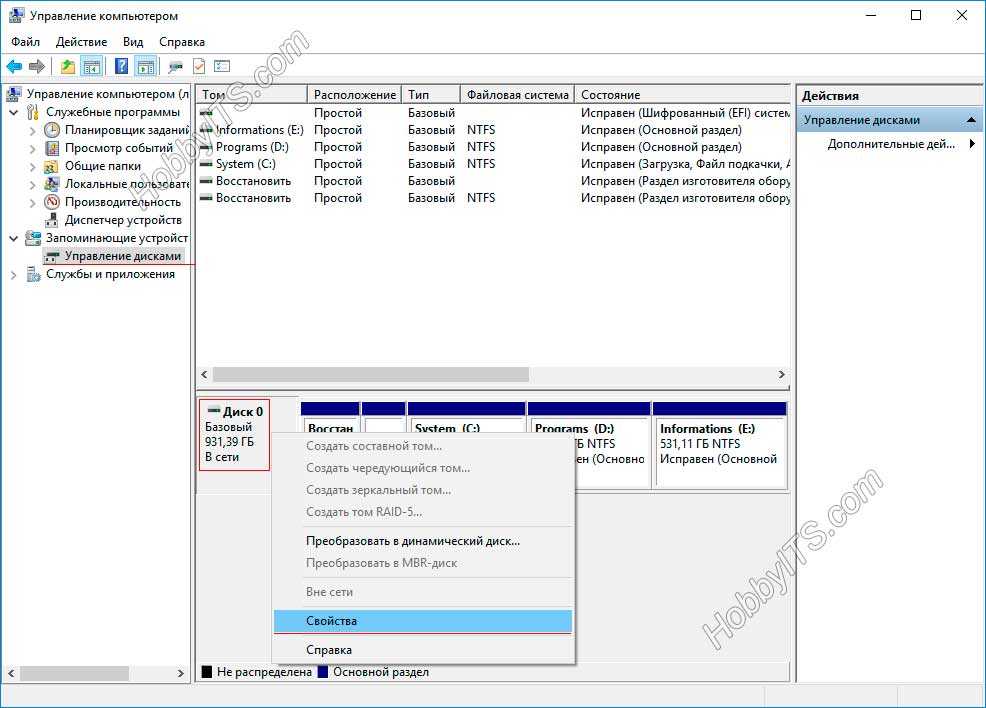 Нажмите правой кнопкой мыши на название диска, в данном случае на «Диск 0», а в контекстном меню выберите пункт «Свойства».
