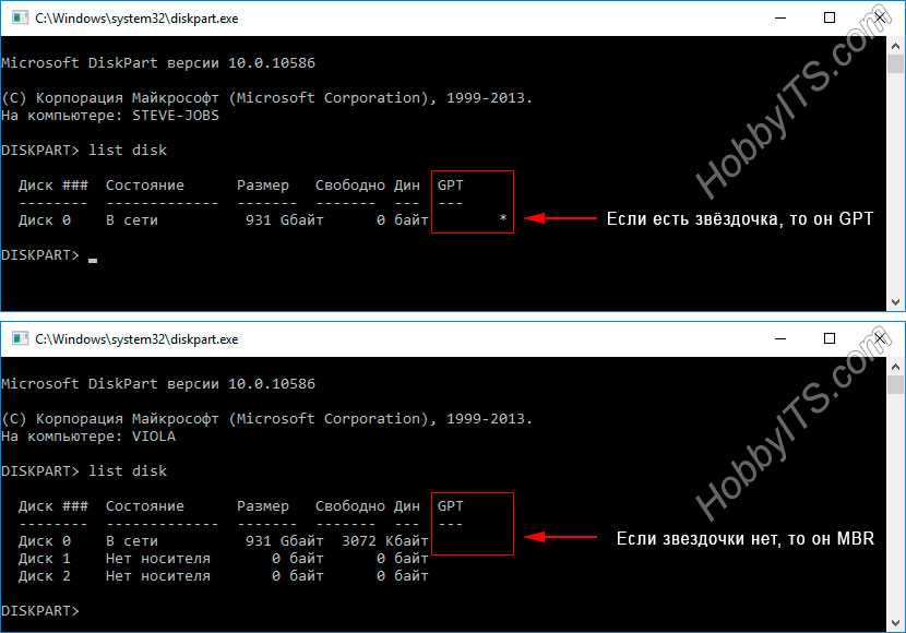 Один из отображаемых параметров обозначен как «GPT». Диск, который имеет стиль раздела GPT отмечен звездочкой («Диск 0»). Значит, остальные диски, где нет звездочек, имеют стиль раздела MBR.