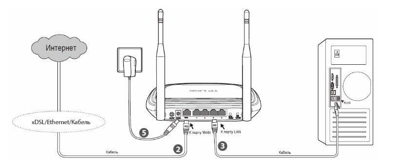 - Ethernet-кабель (№1 на рисунке), заводимый в квартиру провайдером и имеющий на контактах характерные «защёлки», должен быть подсоединён на роутере, в «Настройки» которого владелец не может зайти, к разъёму WAN (иногда — просто Internet), а не LAN. Второй разъём, или группа разъёмов, используются для создания внутренней сети, и «втыкать» в него исходный кабель не имеет никакого смысла.