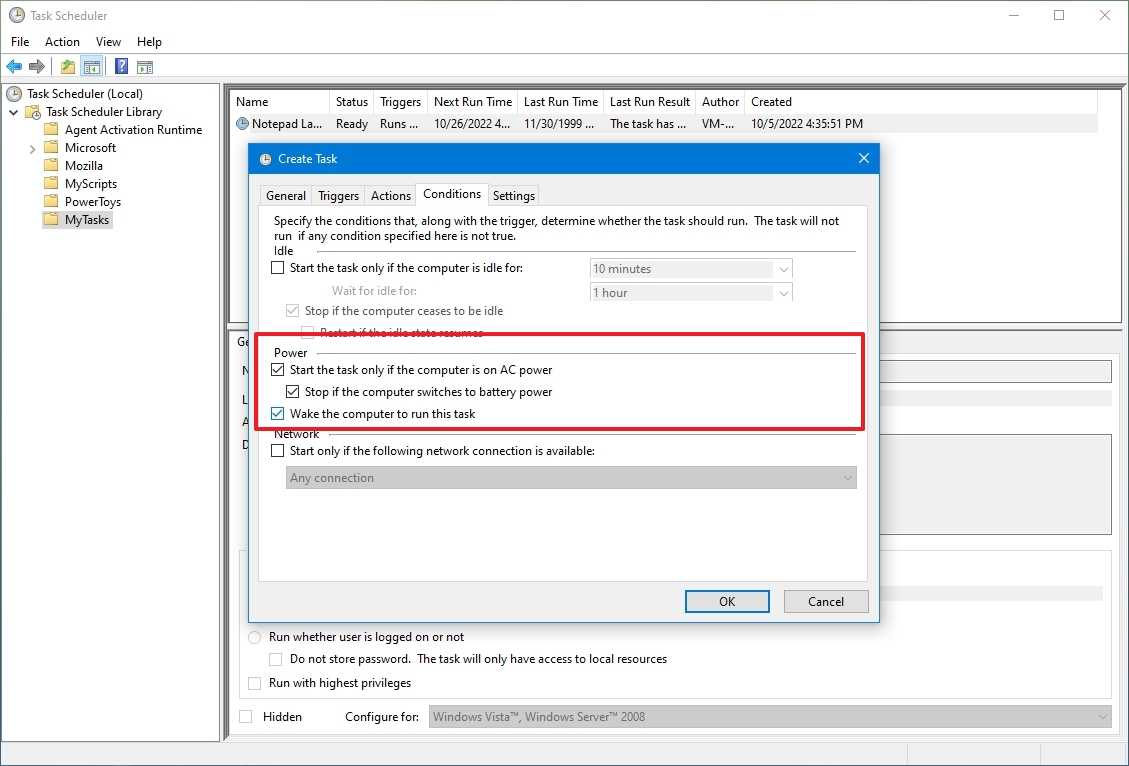 - (Необязательно) Вкладка «Условия» включает параметры, которые в сочетании с параметрами «Триггеры» определяют, когда задача должна выполняться. (Если вы создаете простую задачу, вам не нужно изменять эти параметры. Однако вы хотите убедиться, что параметры питания настроены для вашей ситуации.)