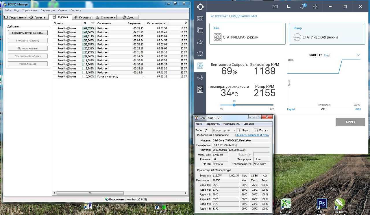 Гоним дальше! Далее, я разогнал процессор до 5 ГГц при 1,38 В (по данным Core Temp напряжение варьируется от 1,36 до 1,41 В). Скорость работы вентиляторов повысил до 69%. Систему оставил на ночь. Проработал без сбоев, максимальная температура составила – 76 градусов. До скальпирования я разгонял процессор до 5 ГГц при напряжении 1,4 В – система тест не выдерживала, температура была под 90 градусов при том же NZXT Kraken X62. Нагрузку для процессора задаёт программа BOINC (Rosetta@home). Чего-то более зверского в плане нагрузки для процессора я не встречал. Пробовал и LinX с AVX и встроенный стресс-тест CPU-Z, Rosetta@home грузит наиболее сильно. Да и сама программа выполняет полезные вычисления.