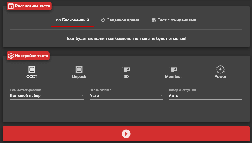 Выберите Настройка теста > OCCT и нажмите кнопку Запустить тест. Все доступные параметры теста: Режим тестирования, Число потоков и Набор инструкций оставляем по умолчанию в авторежиме.