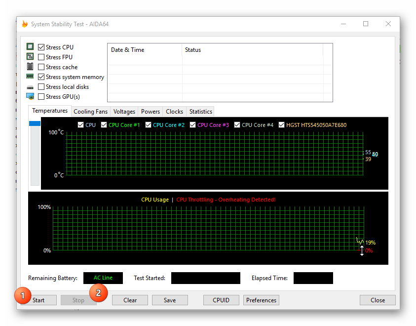 - В верхней левой части только что открывшегося окна выбирайте те компоненты, которые вы бы хотели протестировать на стабильность (в нашем случае будет достаточно только процессора). Нажмите на «Start» и подождите некоторое время.