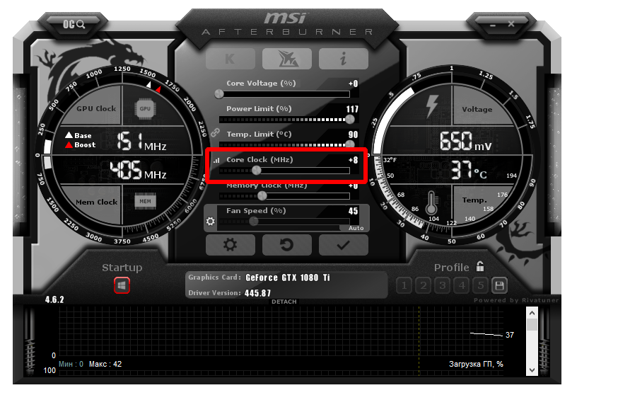 Начнем с Core Clock — это рабочая частота GPU. Поднимать значения надо медленно — по 50 Mhz и тестировать. Если адаптер не выдает артефакты, повышаем еще на ступень. Как только видеокарта начинает выдавать артефакты — понижаем Core Clock на 20 Mhz и повторяем. Все в порядке — повышаем на 10 Mhz и повторяем.