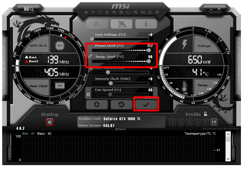 Первое, что вам нужно сделать, это установить ползунки «Power Limit» и «Temp Limit» на максимум. С этими повышенными настройками видеокарта теперь будет более энергоэффективной и должна нагреваться до более высоких температур, чем в базовом режиме. Стоит отметить — видеокарта никогда не достигнет верхних пределов, если не возникнет аппаратная неисправность, поэтому не удивляйтесь, если максимальная температура кажется высокой.