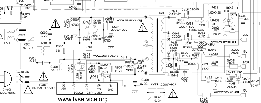 Неисправность. Телевизор не включается. Первое действие — определение дефекта, в первичных цепях ИП он или во вторичных. Проверяется предохранитель F601. Если он целый, то: а) или во вторичных цепях ИП короткое, чаще всего неисправен НОТ, проверяется прибором на “короткое”, б) или неисправность в первичных цепях ИП. Замеряется напряжение на 4 пине IC602. Если напряжение гораздо меньше 12 вольт или 0, то неисправны С609 и (или) R606 и (или) IC602. Если 12-15 вольт, то на 90% неисправна IC602. Если же предохранитель сгорел, то неисправна на 99% IC602.