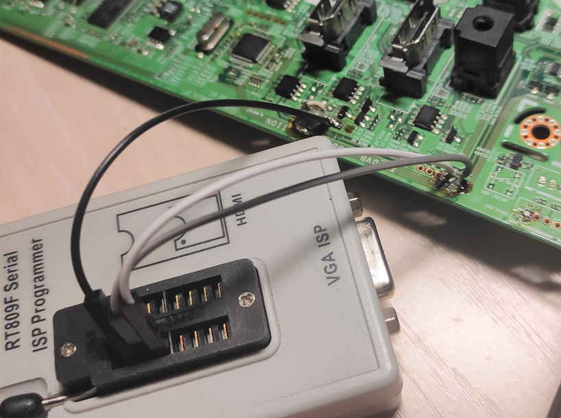 Контроллер WT61P805-RG480WT в корпусе LQFP-48 имеет свою флешь память объемом 64 KB. Перед установкой в плату велтренд нужно запрограммировать в адаптере. Но проще прошить микросхему внутрисхемно непосредственно в материнке. Мы используем для этого простой программатор RT809. Подключиться к материнской плате короткими проводками к обозначенным точкам SCL, SDA, GND и залить прошивку. При записи необходимо выбрать тип микросхемы WT61P806 или P807. Полный объем прошивки 65 536 байт