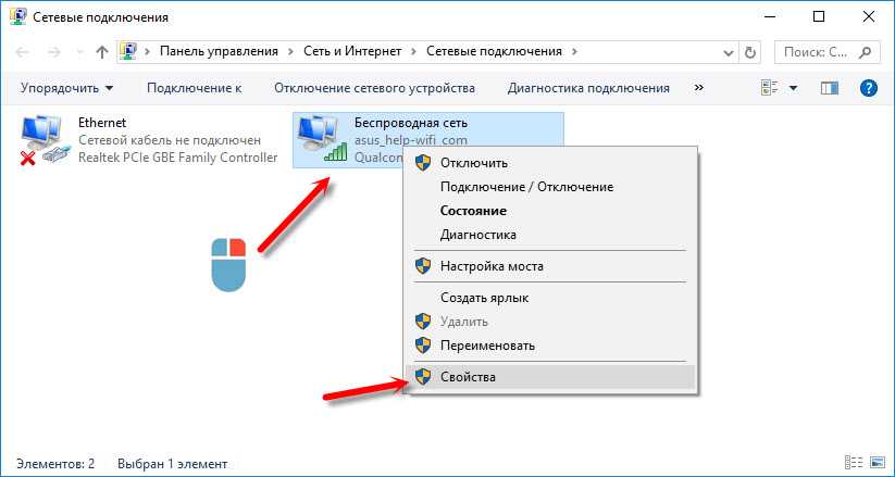 Откроется окно сетевых подключений, в котором будет список доступных адаптеров. Обычно их два. Первый — обычная сетевая карта для кабельного подключения. Второй — адаптер WiFi. Выбираем тот их них, через которых компьютер подключен к Интернету и кликаем по нему правой кнопкой мыши: