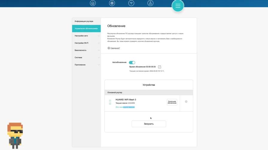 Меню обновления позволяет проверить наличие новых прошивок.
