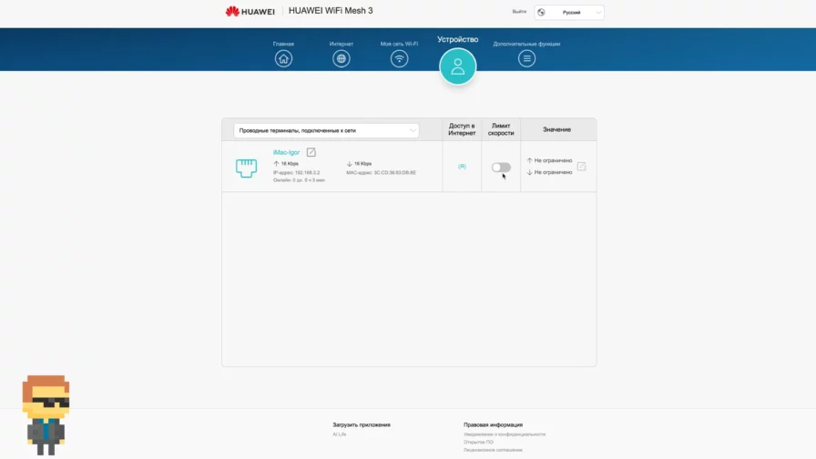 На вкладке «Устройство» показаны девайсы, которые подключены к сети по проводу и по воздуху. При необходимости устанавливаем для определенных устройств лимит скорости.