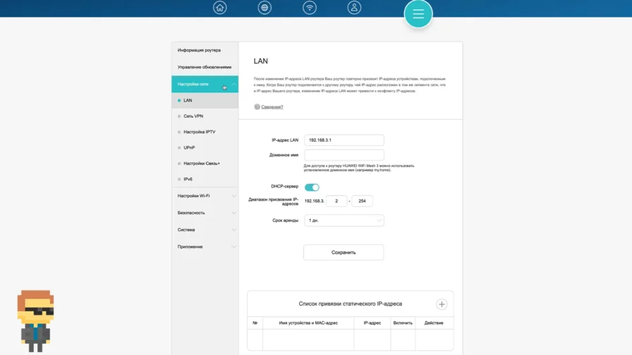 В настройках LAN можно назначить сетевые адреса устройствам, подключенным по проводу. Тут тоже ничего не трогал.