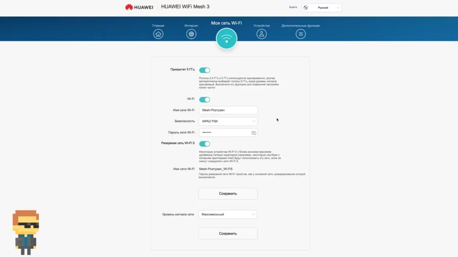 Вкладка «Моя сеть Wi-Fi» содержит параметры и настройки беспроводной сети. Определяем, отдавать ли предпочтение диапазону 5 ГГц при равном уровне сигнала. Активируем или отключаем резервную сеть Wi-Fi 5. Выбираем из выпадающего списка уровень сигнала: максимальный, средний или слабый.
