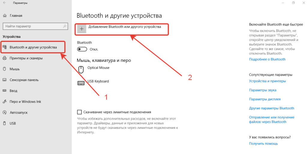 - Зайдите в «Настройки» в раздел «Bluetooth и другие устройства» и перейдите в соответствующие параметры «Другие настройки Bluetooth». Откроется окно, в котором нужно поставить галочку напротив «Разрешить Bluetooth-устройствам обнаруживать этот компьютер» и нажать «Применить».Попробуйте подключить ваше устройство.