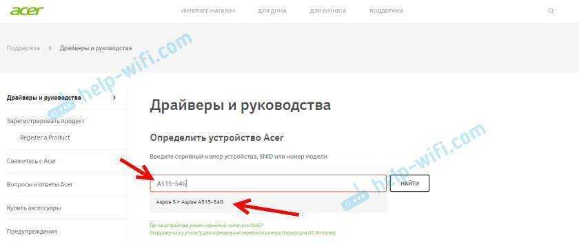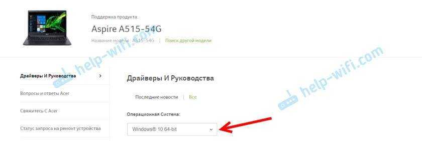 Например, ноутбук Acer модель Aspire 5 A515-54G. Заходим на сайт Acer и ищем свою модель (обычно в разделе “Поддержка”, “Загрузки”).