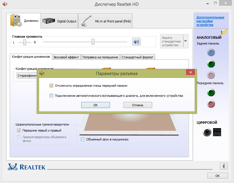 3. Отключаем определение гнезд передней панели (для ноутбуков может быть не актуально):