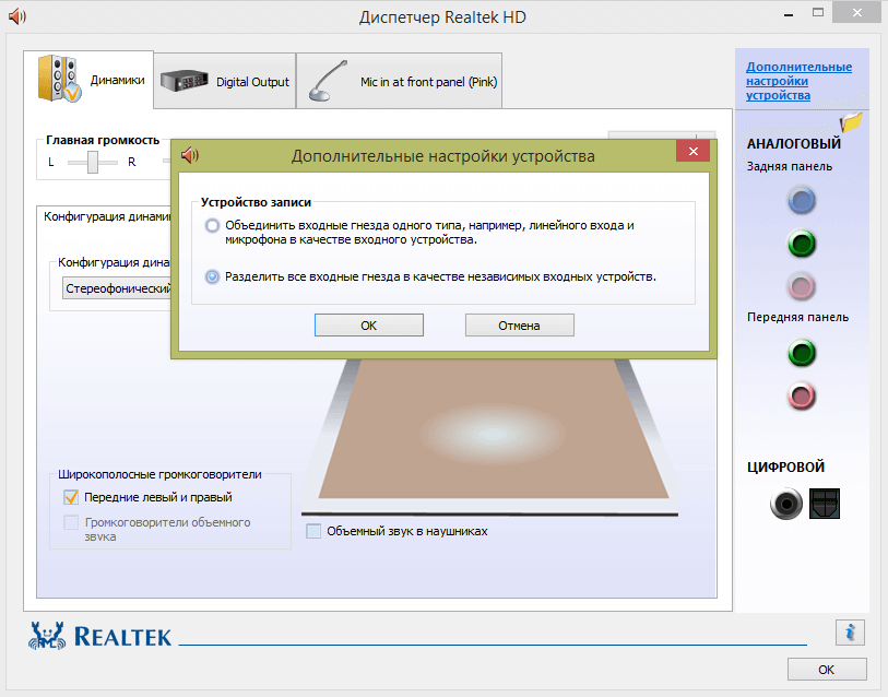2. Заходим в настройки Realtek: разделить все входные гнезда в качестве независимых входных устройств: