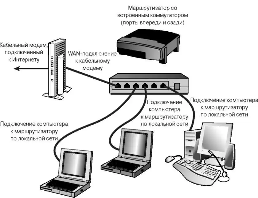 Или так: роутер объединяет все устройства в локальную сеть (в которой они могут обмениваться файлами, или можно поиграть в игры) с возможностью выхода в интернет (если интернет подключен и настроен).