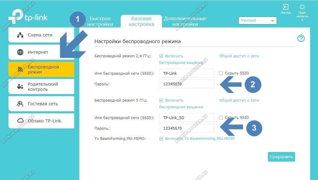 В базовых настройках находим в меню раздел «Беспроводной режим». Вот именно в этом разделе можно сменить пароль на Вай-Фай у ТП-Линк для каждого из поддерживаемых диапазонов — 2,4 ГГц и 5 ГГц. Если Ваш роутер поддерживает только один беспроводной диапазон 2,4 ГГЦ, то будет только одно поле для ввода пароля.