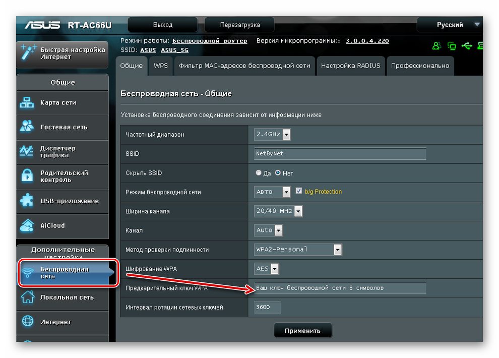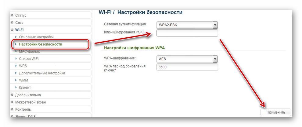 В поле «Ключ шифрования PSK» введите новые данные. При этом старый указывать не придется. Нажмите «Применить», чтобы обновить параметры.