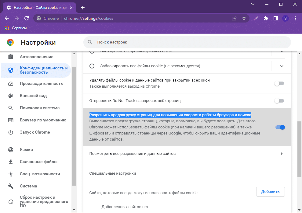 - включите функцию «Разрешить предзагрузку страниц для повышения скорости работы браузера и поиска».