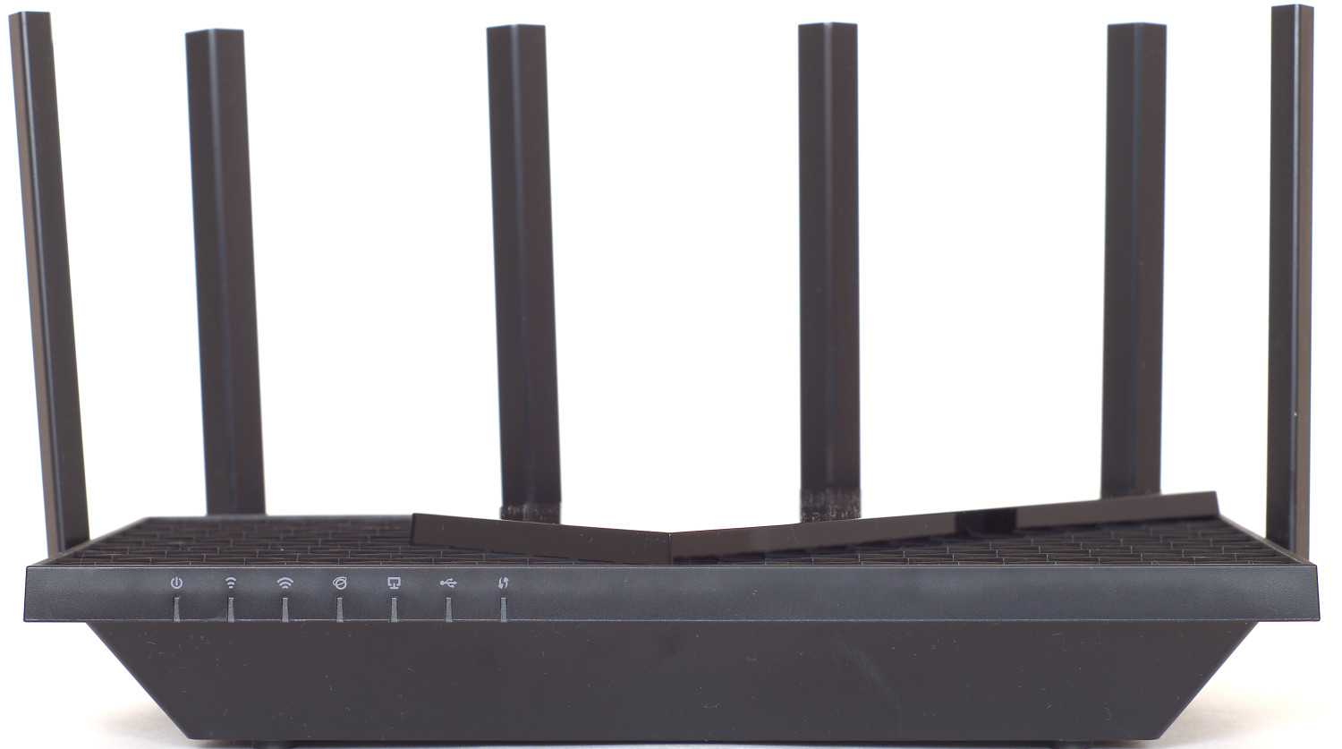 Благодаря шести внешним 5 дБ поворотным антеннам, роутер TP-Link Archer AX73 смотрится весьма солидно. Корпус выполнен из черного матового пластика и элементами глянца, что делает его вид оригинальным. В плане размеров он несколько крупнее бюджетных роутеров (~27 см длина х ~15 см ширина) и немного «толстоват» (почти 5 см), поэтому придется поискать для него место на столе или полке, особенно если учесть, что антенны у него несъемные и имеют высоту 14,3 см.