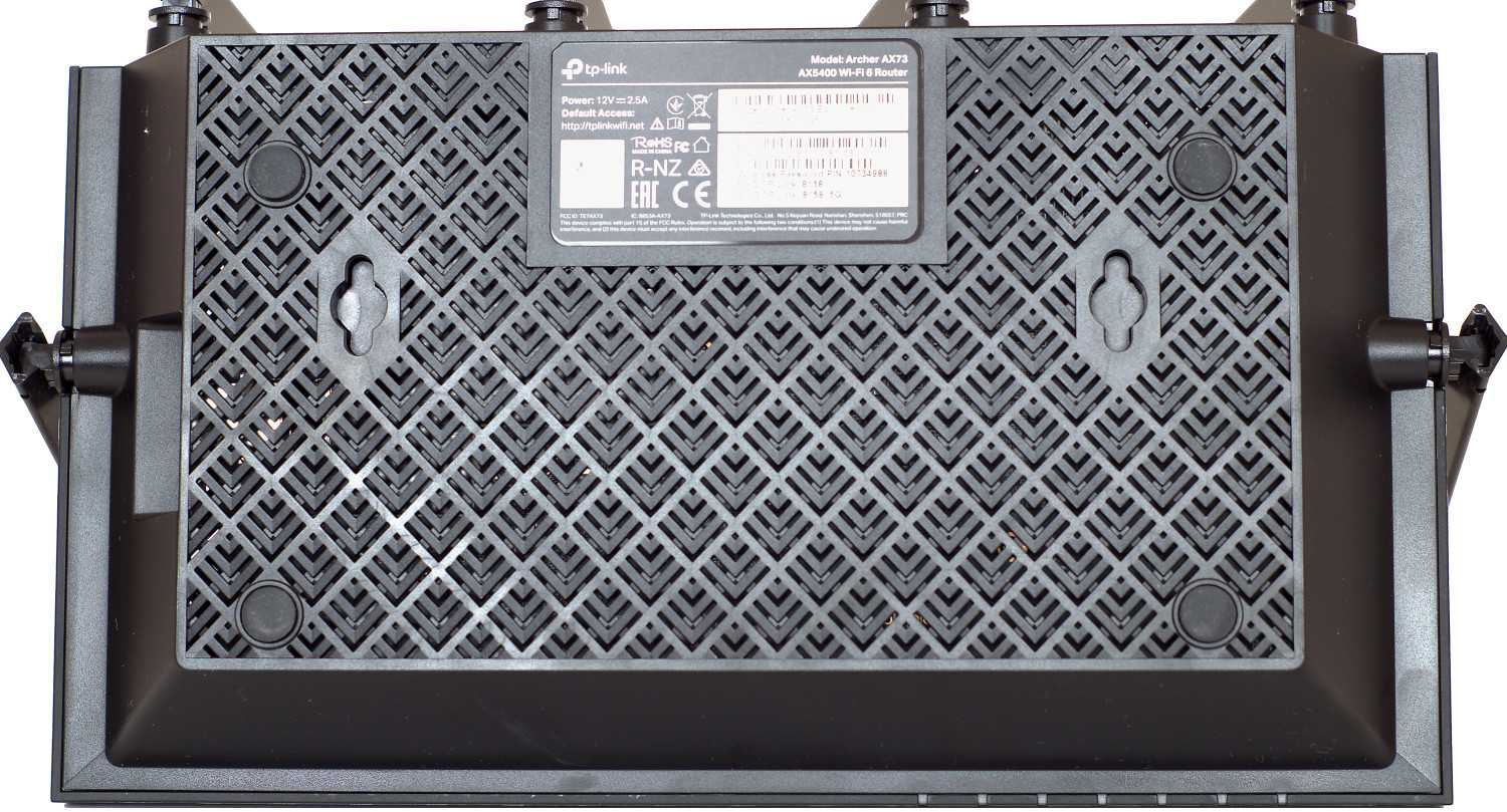 Дно корпуса имеет чуть более упрощенную структуру, но также практически полностью состоит из отверстий вентиляции – исключение область ножек, отверстий для крепления на стену и центральной зоны с наклейкой, содержащей информацию о модели TP-Link Archer AX73, рабочем напряжении/токе (12 В/2.5 А), серийном номере, MAC-адресе и настройках беспроводной сети (название SSID и пароль).