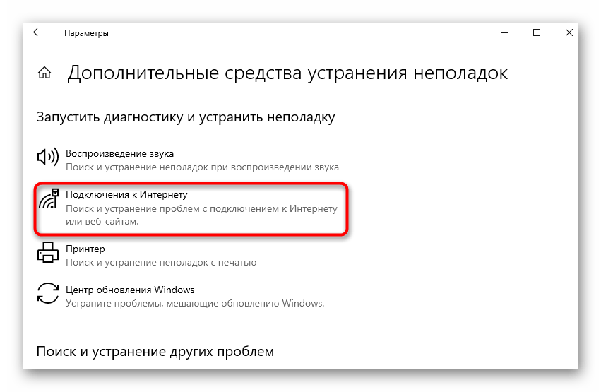 После запуска сканирования нажмите по варианту «Устранение неполадок подключения к Интернету».